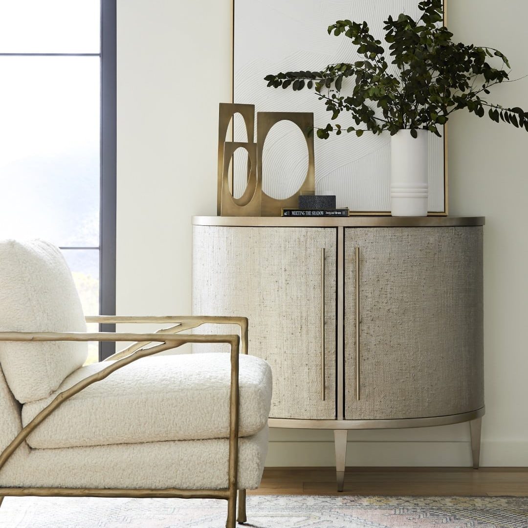 Layering with Luxe Finishes: The true magic happens when raffia is contrasted with other materials. The “Reveal” series by Vanguard, for example, combines the organic beauty of woven raffia with the sleekness of rich woods, honed marble, and metal accents. This juxtaposition is what creates that sophisticated, multi-layered look.