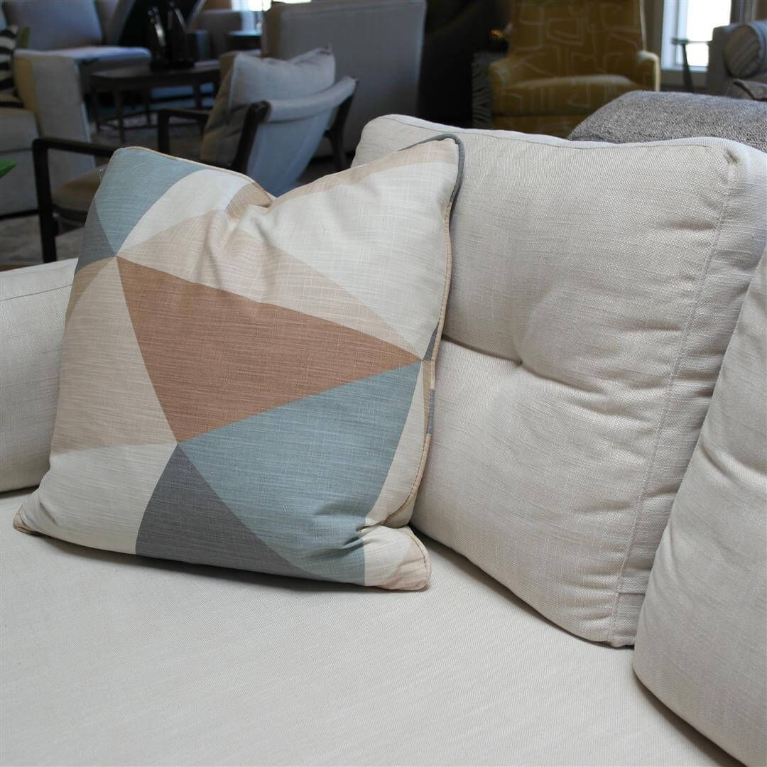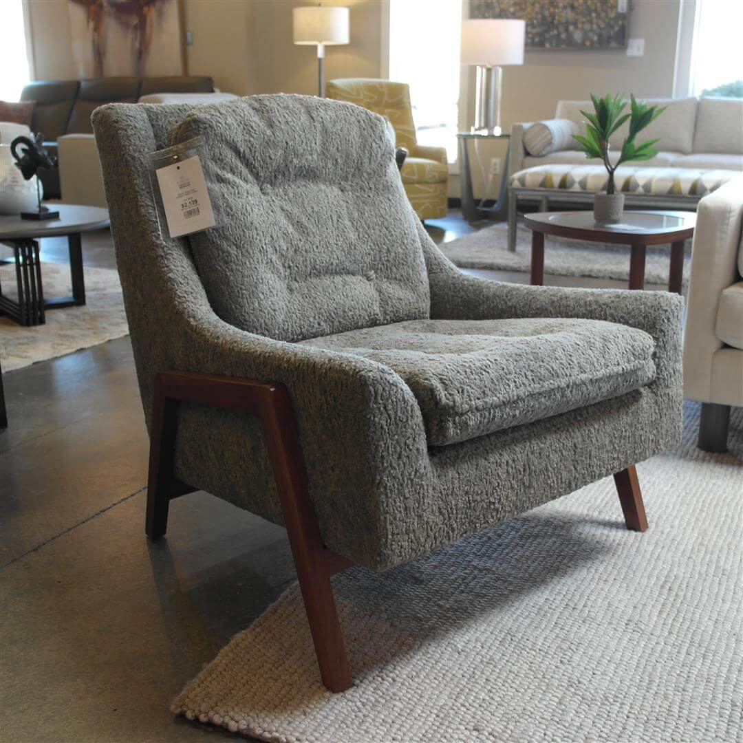 The Kim Salmela designed Marley has captured our hearts. Marley’s tufted back, optional single cushion seat and soft-track with pillow arms combine to create one of today’s great looks. Grouped here with the wonderful new Grace chair with walnut frame in a snuggly fabric. The Quinn ottoman is seamed allowing for a unique contrasting application.