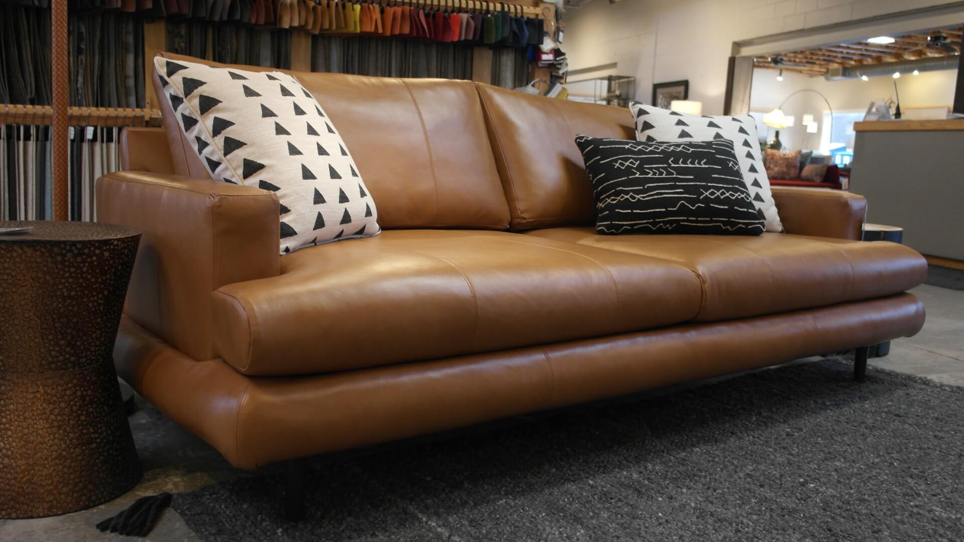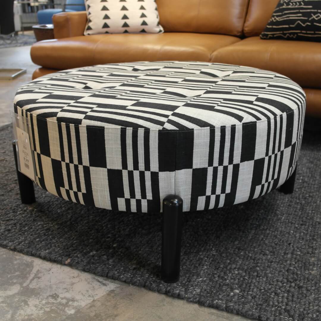 Black and white. You can count on black and white for a dramatic style statement. We’ve varied the theme just a bit here by covering the Somerset sofa in a rich, carmel leather. Wow! We’ve brought the new Nelson large ottoman in a wonderful black and white geometric fabric and black finish. The equally stunning Gracie channel chair with walnut frame is in a black woven fabric. Love how this group turned out!