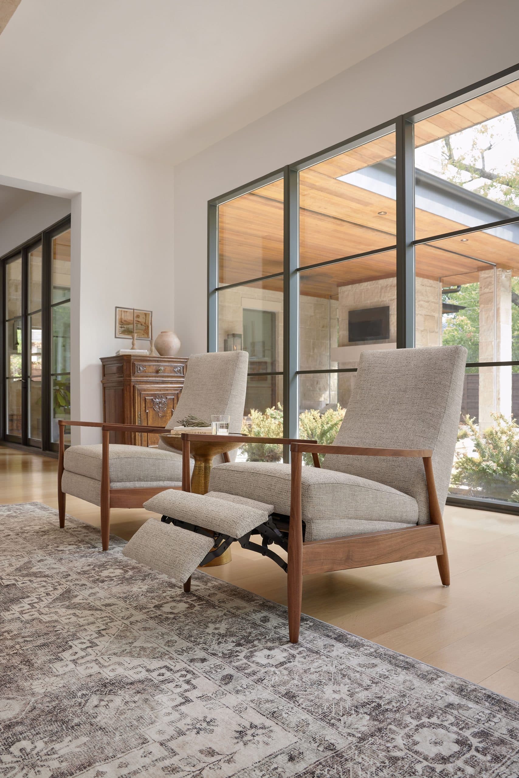 Wooden arms are formed into soft geometric shapes, making this recliner chair appear as though it is sliding across the terrain. Experience the invisible mechanism while you recline into its down-filled channel-tufted back and seat cushions.